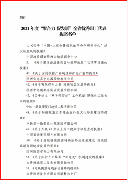 近日,從陜西省總工會(huì)傳來(lái)喜訊,寶光集團(tuán)《關(guān)于固封極柱產(chǎn)品制造部擴(kuò)充產(chǎn)能的提案》榮獲陜西省2021年度“聚合力 促發(fā)展”全省優(yōu)秀職工代表提案。