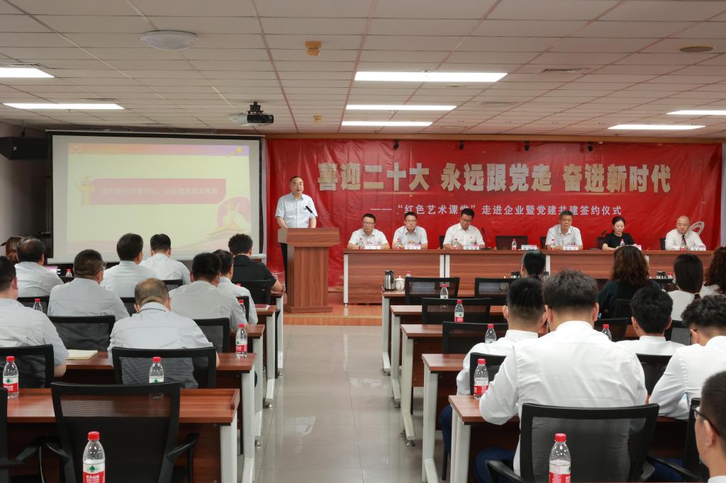 謝洪濤對(duì)各位領(lǐng)導(dǎo)、嘉賓的到來(lái)表示誠(chéng)摯歡迎,他指出,學(xué)校在人才培養(yǎng)、經(jīng)營(yíng)管理、技術(shù)研究等方面給公司提供了無(wú)私支持,此次“紅色藝術(shù)課堂”進(jìn)企業(yè)進(jìn)一步激發(fā)了干部職工崇高的愛(ài)黨愛(ài)國(guó)情懷,雙方凝聚共識(shí)、結(jié)對(duì)共建、簽約揭牌,將開(kāi)啟校企黨建聯(lián)建共建新紀(jì)元,掀開(kāi)校企黨建結(jié)對(duì)共建、資源共享、優(yōu)勢(shì)互補(bǔ)、共同提高的新篇章。為此,他提出三點(diǎn)希望:一是要充分認(rèn)識(shí)結(jié)對(duì)共建的重要意義,提高站位,增強(qiáng)責(zé)任感、緊迫感和使命感,圍繞校企高質(zhì)量發(fā)展,強(qiáng)強(qiáng)聯(lián)合,共同提高,努力建設(shè)校企黨建聯(lián)建共建的窗口和示范基地;二是要充分發(fā)揮結(jié)對(duì)共建的資源優(yōu)勢(shì),通過(guò)多種方式借鑒好方法好經(jīng)驗(yàn),實(shí)現(xiàn)黨建與生產(chǎn)經(jīng)營(yíng)、黨建與學(xué)校發(fā)展工作良性融合發(fā)展,實(shí)現(xiàn)雙方共贏;三是要充分彰顯結(jié)對(duì)共建的時(shí)代價(jià)值,持之以恒推進(jìn)落實(shí)黨建共建基地工作規(guī)劃,營(yíng)造濃厚的共建工作氛圍,按工作計(jì)劃扎實(shí)有效開(kāi)展各項(xiàng)聯(lián)建共建活動(dòng)。